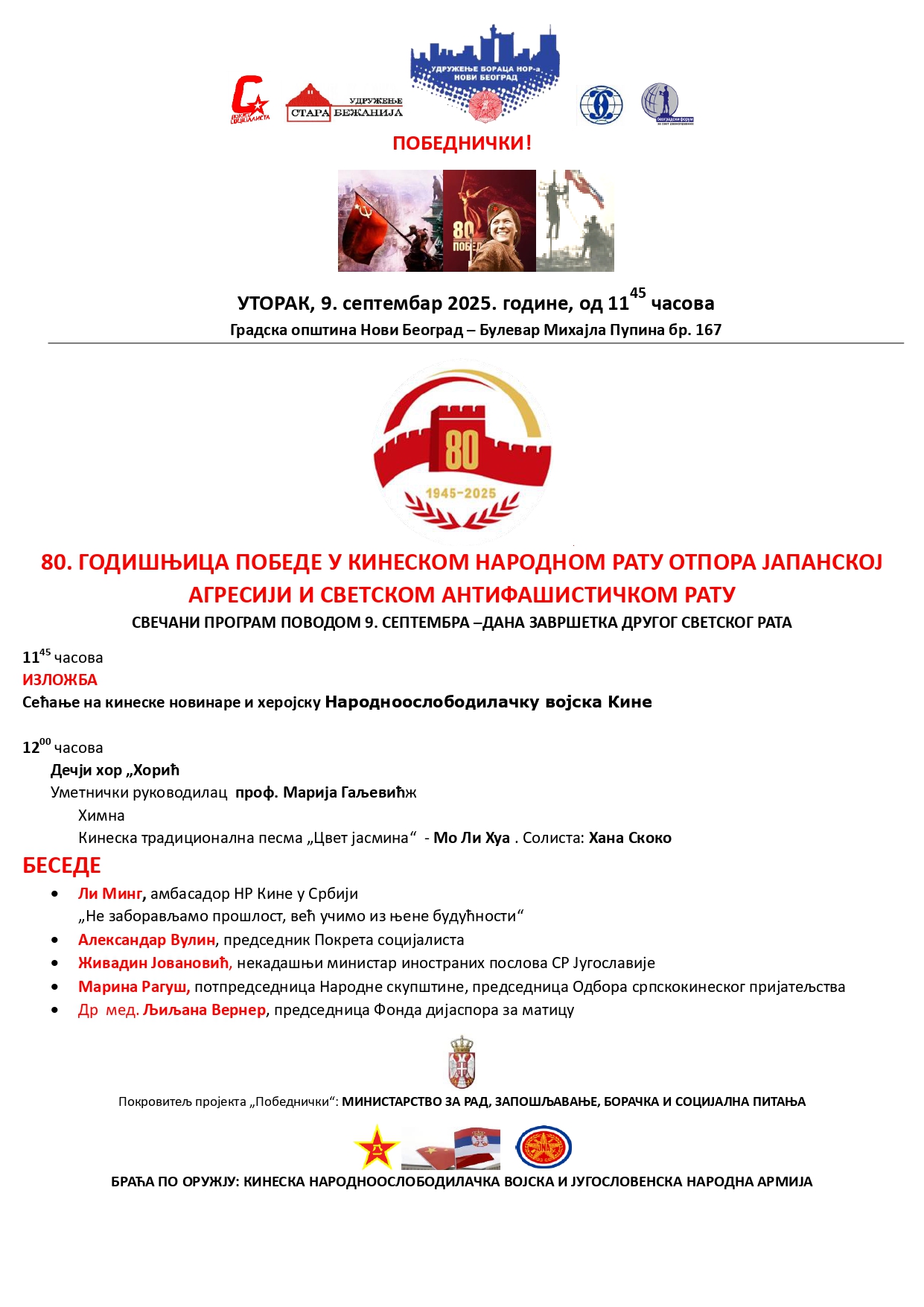 Обележавање 80-е годишњице победе у Другом светском рату, ослобађања Кине од јапанских агресора и окупатора, није само дуг према славној историји и одавање дужне поште милионима бораца плих за слободу и жртвама обичних људи, жена и деце. То је истовремено опомена и позив да се хитно зауставе ратни бубњеви, милитаризација и доливање уља на ватру текућих ратова, да и најтврдокорнији заговорници конфронтације и хегемонизма прихвате нове реалности и да се придруже изградњи новог светског поретка у чијем центру неће бити интереситзв. златне милијарде, већ интереси целог човечанства.